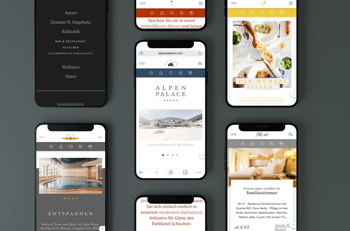 From an exclusive 5-star retreat to a charming 3-star hotel: for the Alpine Spa Resorts, our web design agency in Tyrol developed a brand universe that unites them all, while allowing each property to express its own individuality. A carefully crafted concept was the foundation for presenting every hotel under one umbrella brand, highlighting both their distinct character and shared values. The rebranding laid the groundwork. Web design, programming, art direction for the photoshoots, and print design — from menus to morning newsletters — along with countless fine details, completed the cohesive brand experience.