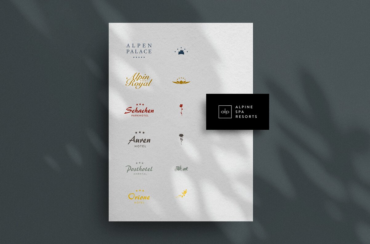 Our print and web design agency in Tyrol created the brand identity for the Alpine Spa Resorts including Alpen Palace, Alpin Royal, Schachen, Auren, Posthotel, and Orione.