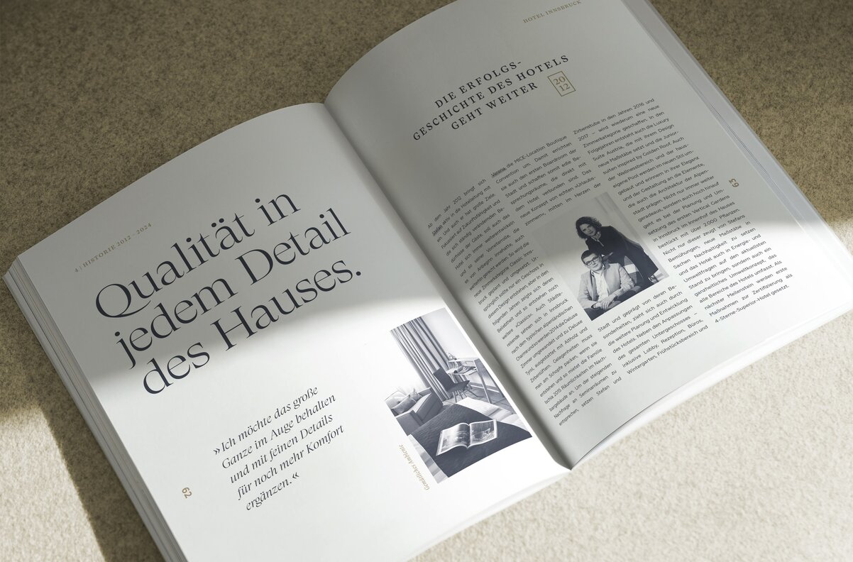 For the renowned Hotel Das Innsbruck, we had the honour of evolving its corporate design and giving the house a distinguished new presence for its 50th anniversary. Alongside updates to the colour and typography concept, we created premium print materials and a commemorative logo that bridges history and modernity. The highlight: the anniversary book, an exclusive editorial product, fully designed and edited by our team. A collection of stories, memories, and moments that showcase what makes this hotel truly special.