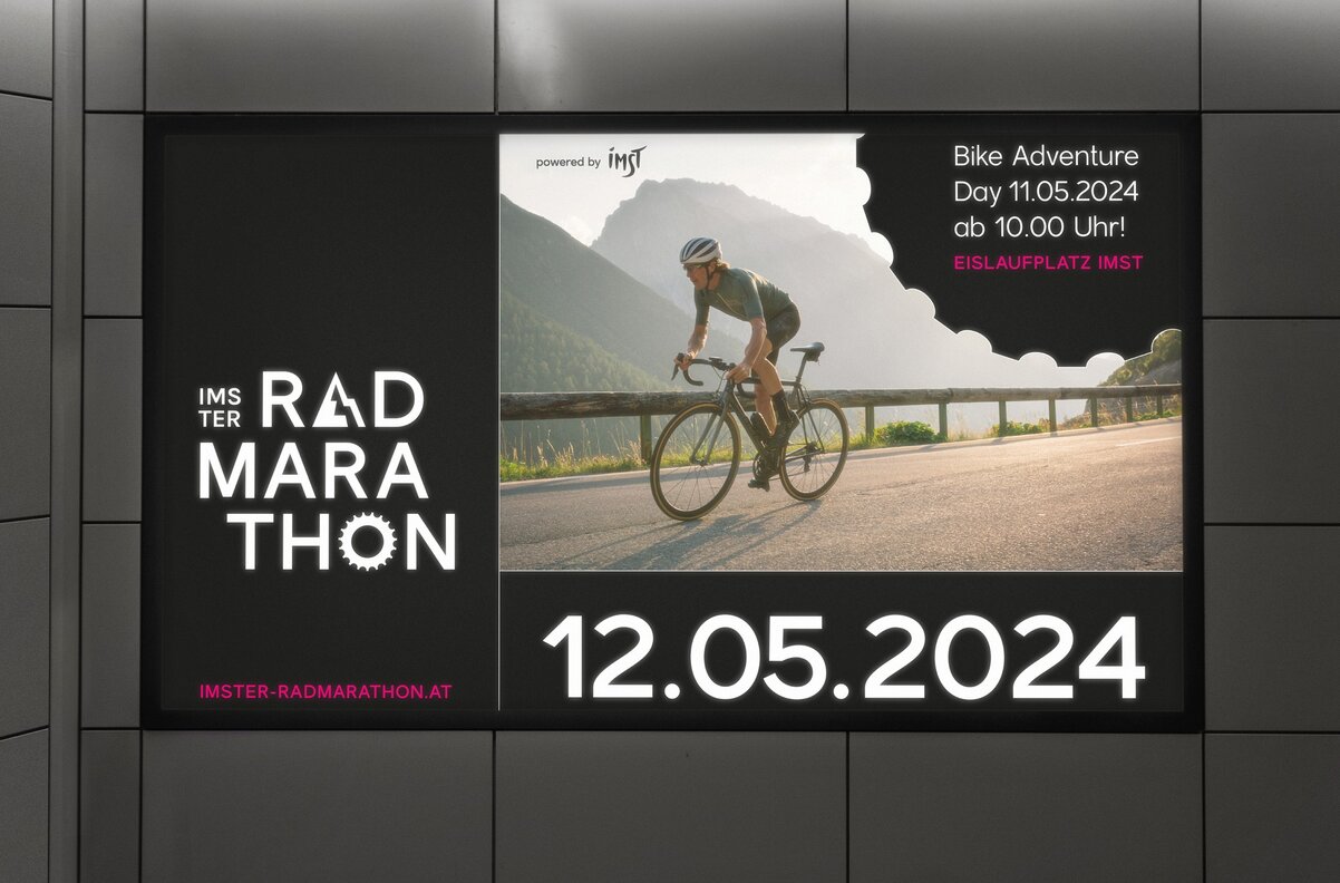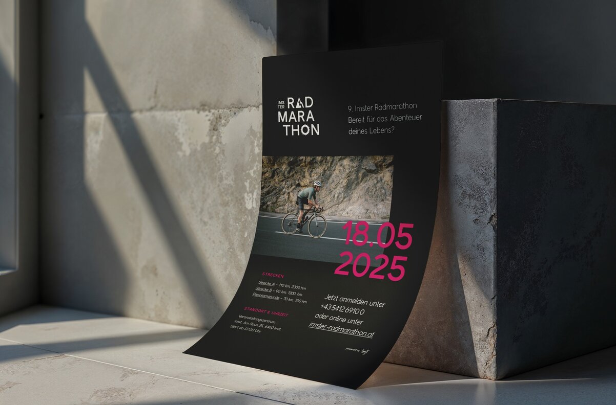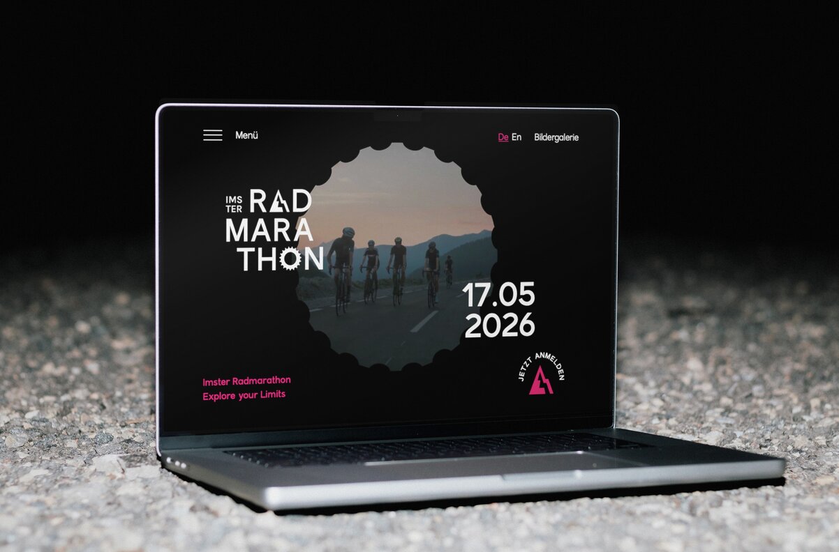New logo, new energy, new momentum: for the Imster Radmarathon, we created a branding that feels sporty, modern, and bold. The “A” as a mountain and the “O” as a chainring capture the essence of the event: Alps meets adrenaline. The signal colour pink ensures maximum visibility – a highlighter in a sea of cycling events, daring and unmistakable. From web design and programming to print materials such as posters and banners, the new look runs consistently through all channels: fresh, dynamic, and full of drive.